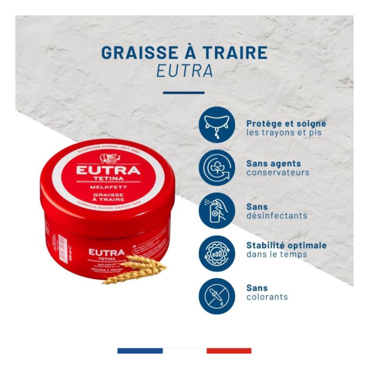 La graisse à traire offre une protection optimale des pis et des trayons lors de la traite des vaches, moutons et chèvres. Elle permet également de protéger et soigner les pis en créant une couche protectrice et aide à la guérison des petites blessures. Préparée à partir d’huiles minérales raffinées de haute qualité, elle facilite la traite grâce à ses propriétés de lubrification. Ne convient pas en agriculture biologique.